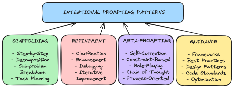 Intentional prompting incorporates prompt engineering techniques but embeds them within a comprehensive methodology for approaching programming tasks. While prompt engineering asks “How can I get the best output from this AI?”, intentional prompting asks “How can I use this AI as part of a thoughtful development process that maintains my understanding and control?”