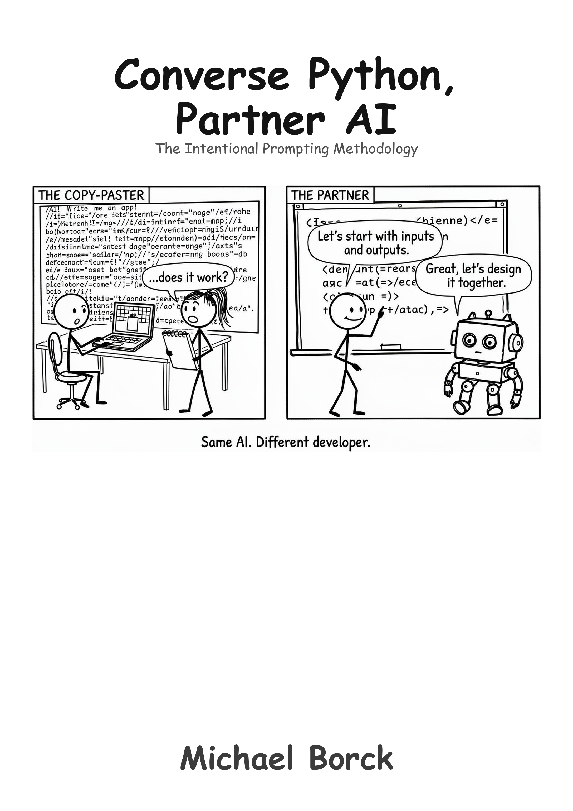 This book applies the methodology developed in Conversation, Not Delegation: How to Think With AI, Not Just Use It (Borck, 2025) to software development. That companion book covers the full framework in depth: the Conversation Loop, the VET framework for evaluating AI output, the average-versus-precise decision grid, and the principle of AI Last. If you want the underlying rationale for why the approaches in this book work, or you want to share a discipline-neutral version with non-developer colleagues, start there. Available at https://michael-borck.github.io/conversation-not-delegation.